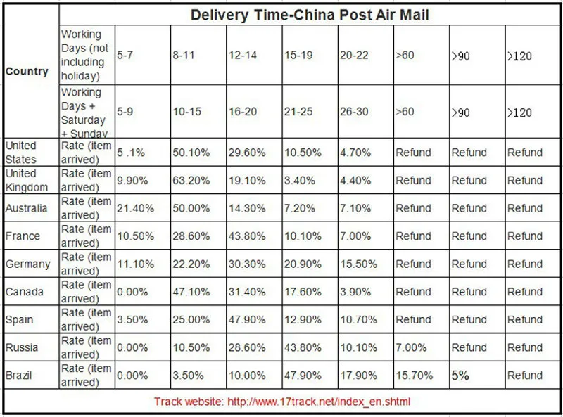 Usually the shipping is China Post Registered Air Mail or E-packet ,it will take about 15-45 days when parcel reach your country, if you have not received your parcel in 45 days of shipment, please contact us to check, we will extend the delivery date for you at the first time. If after 60 days you still do not receive the parcel, please contact us again, we will make a full refund.